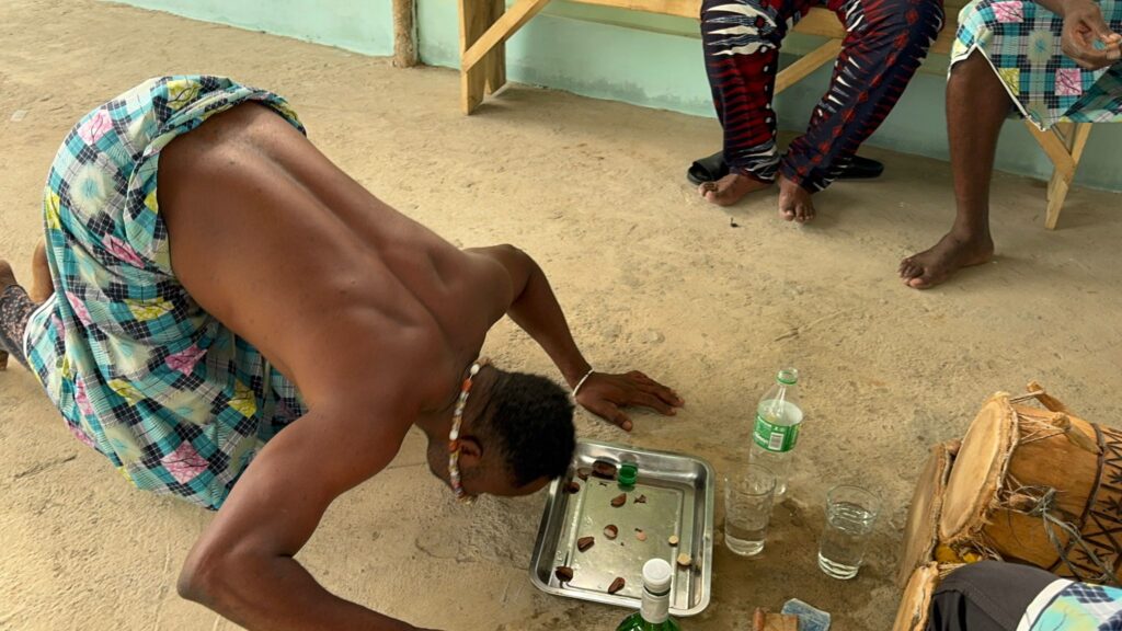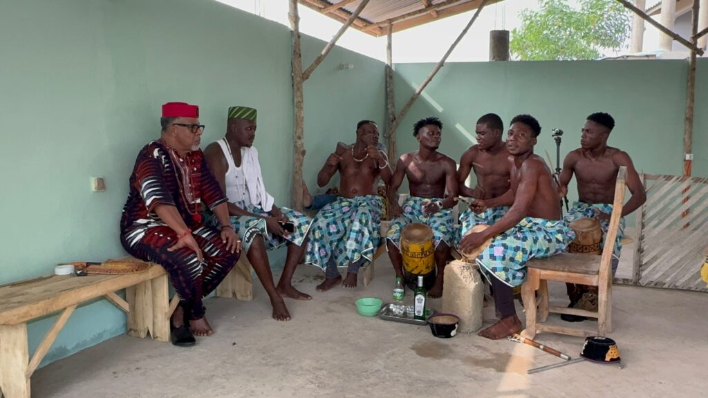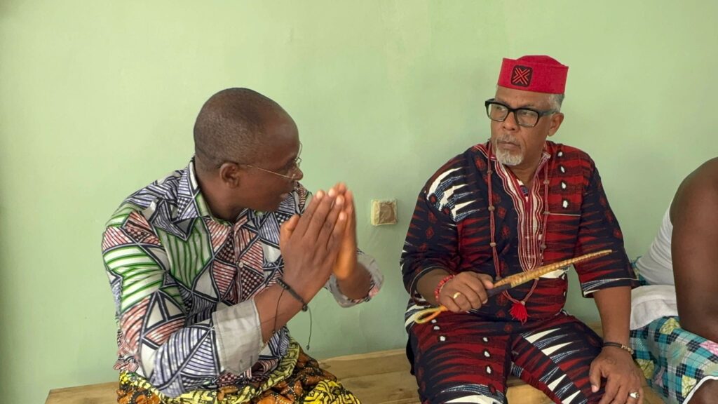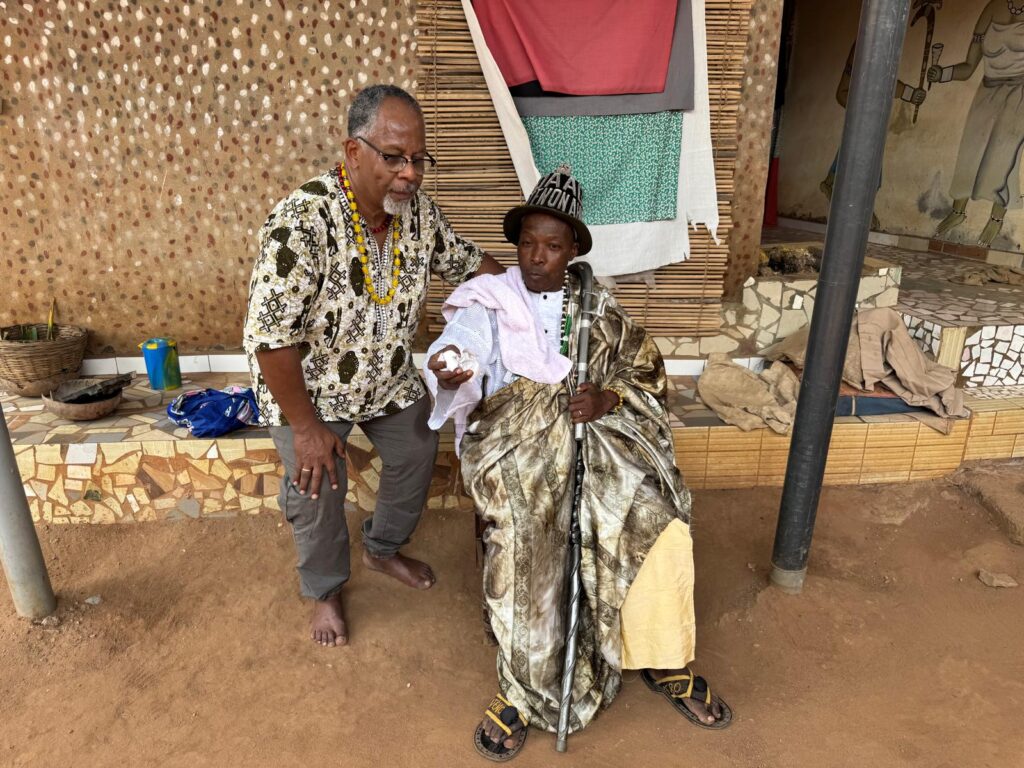 Para cerrar la jornada, resultaba ineludible visitar a nuestro gran hermano Dah Daagbo, Avimadjènon y jefe de una de las casas-templo más respetadas de la ciudad, cuyo patrón espiritual es precisamente Sakpata. Este encuentro selló la visita desde una dimensión de hermandad, respeto y continuidad espiritual, reafirmando la centralidad de Ouidah como territorio vivo de la tradición vodùn y como espacio privilegiado para el diálogo entre memoria, ritual y creación contemporánea.